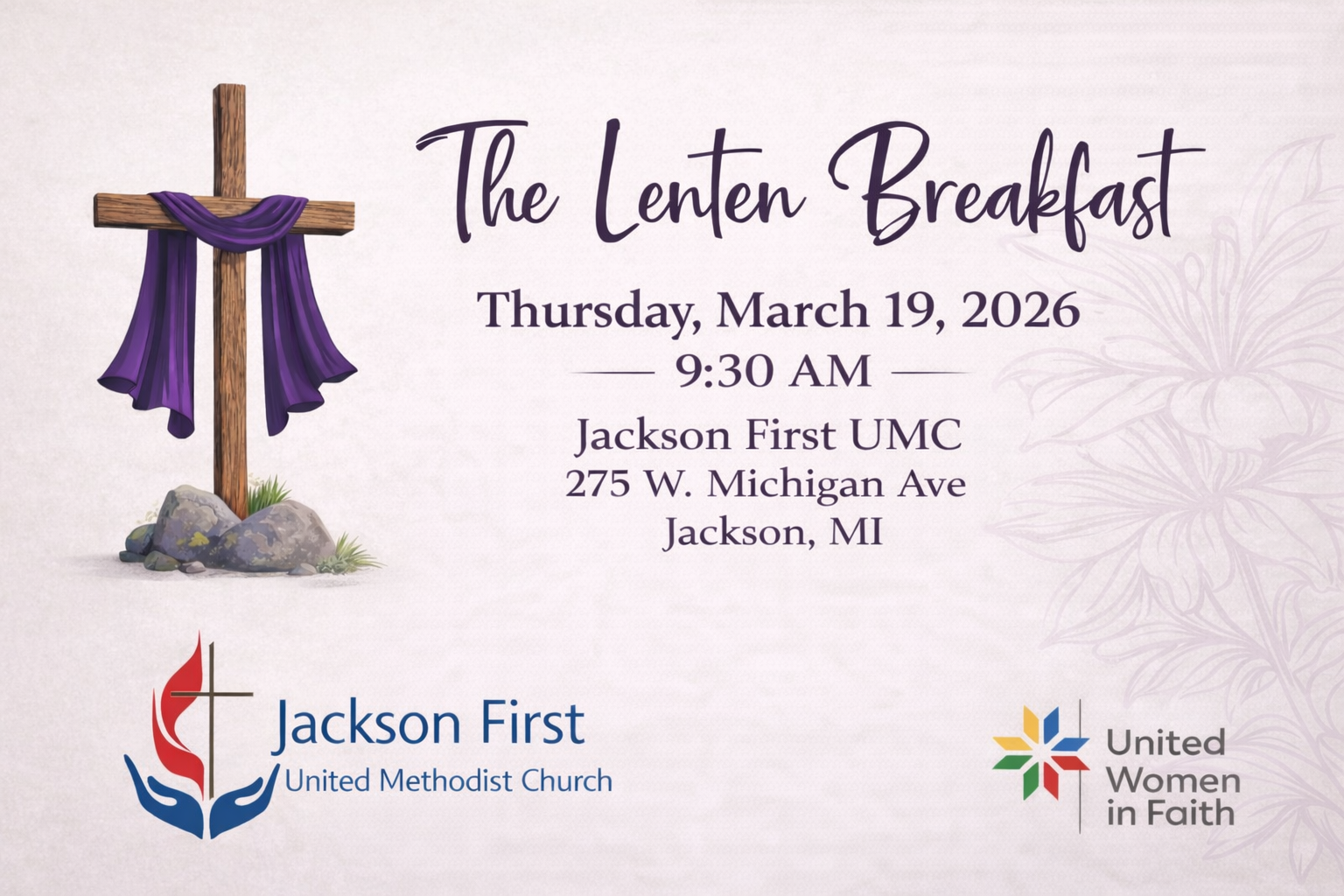 Join us on Thursday, March 19, 2026 at 9:30 AM for a meaningful morning of fellowship, reflection, and preparation as we journey through the season of Lent together.